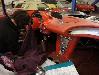This is becoming an epic task. Here the dash is being refitted after the electronic replica tach is installed. We are gradually righting the wrongs of previous specialists though and this 62 is really starting to take shape.