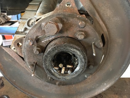This side was showing no signs of any wheel bearing problems, no play, no discernible noise, but the brake backing plate needed replacing and so the spindle had to come out. It came out a bit too easily and this is what was revealed, another disintegrated wheel bearing.