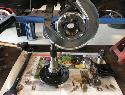 Do it once and do it right. This shows the rebuilt rear wheel bearing assembly refitted to the trailing arm, and the new spindle with the outer bearing installed and the spacer and correct shim. This has all been pre-assembled on our mandrel and feels good.