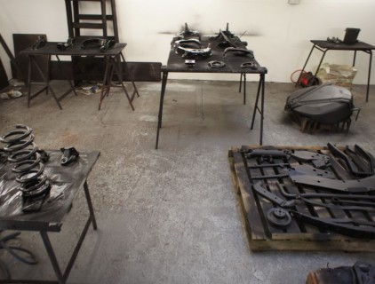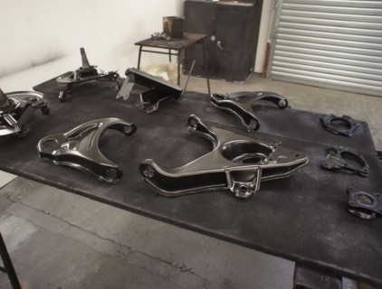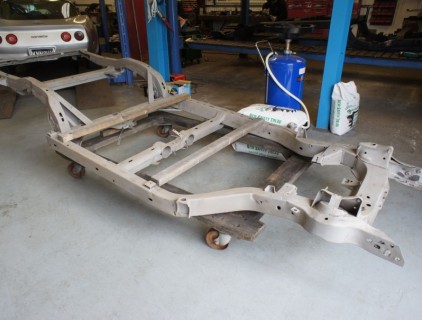 Richard's 69 after sandblasting, the chassis needs a good bit of repair. Here the anciliaries are getting a coat of primer.