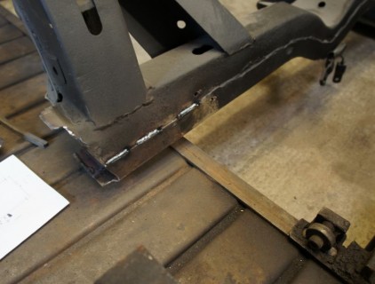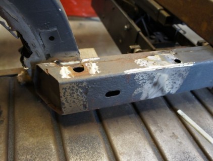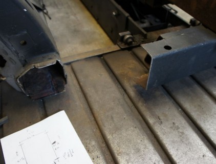 Richard's 69 with some pretty major chassis problems. Here we have cut out the bad metal of the rear frame rail, and are preparing the repair section to go in. I have a collection of donor chassis we can use for these pieces.