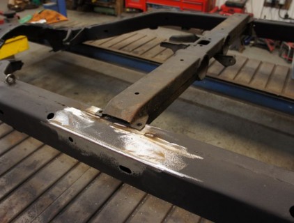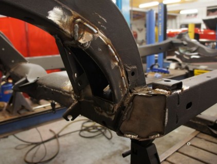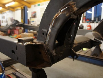 Here the trailing arm pocket reinforcements have been removed to clean the shale out between the two skins. The chassis end plates have been removed to clean out and repair the end rails, and we are part way through the manual to auto crossmember conversion.