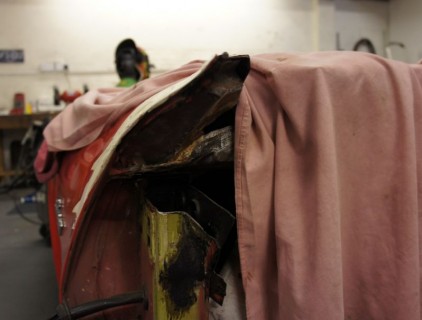 Tony's 71 has had the windshield frame completely removed and the new assembly is about to be tacked into place. No mean feat this one, you can only get this kind of work done at Corvette Kingdom.