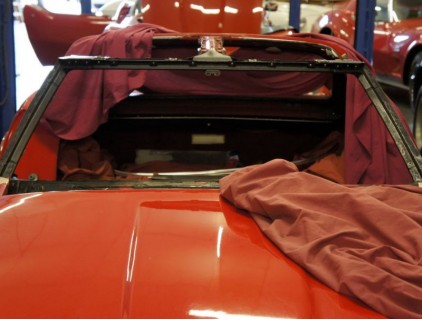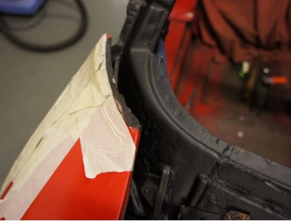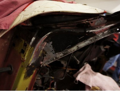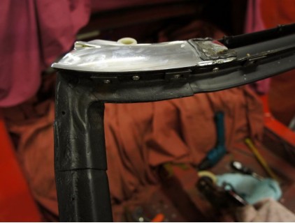 Tony's 71 getting put back together. Here you see the used lower windshield corners and tops of the door pillars from our donor vehicle, the uprights and top corners are also from the same donor, but the top windshield frame is a new piece.