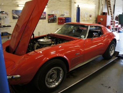 Gary's 71 at the start of the job, here we are about to remove a lower a-arm to repair some cracks in the chassis.