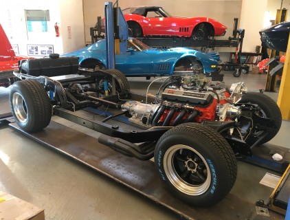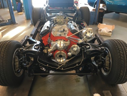 Andys chassis is fully assembled now. We have been waiting for the rack and pinion system for some time now due to the special hose kit to match up to the remote reservoir power steering pump. It is finally here and on the car. The pulleys look great, the prop-shaft is on, and we've got steering....