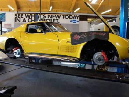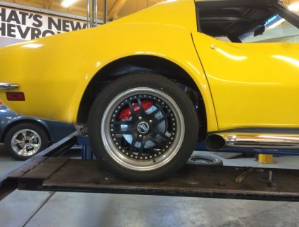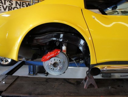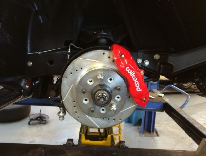 Rob's 72 with the body back on now and receiving the very smart set of bright red wilwood aluminium callipers and crossdrilled rotors. The weight difference between these and cast iron callipers is incredible, they look great and stop well too - whats not to like....the price!