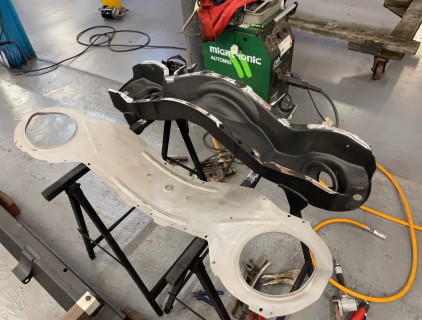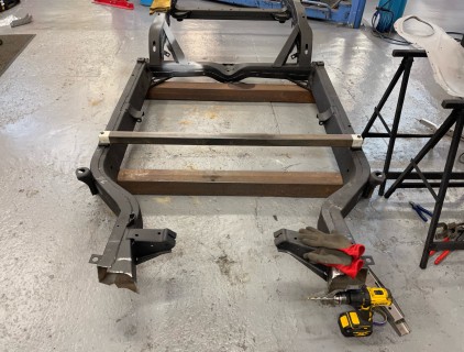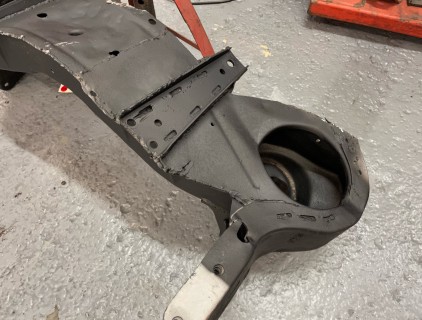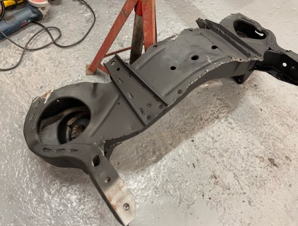 Chris' chassis part way through the rebuild. Here the bent front crossmember has been removed and we are part way through preparing a donor crossmember for fitting. Not an easy task!