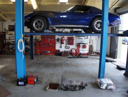 Alex's 74 with the old auto transmission removed, ready for the new 5 speed manual to go in, sidepipes next...