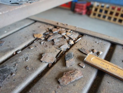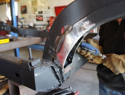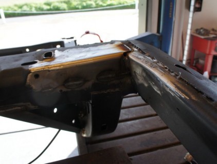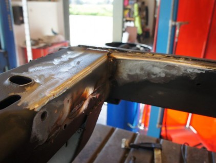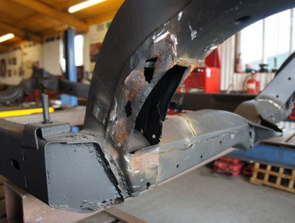 Hohn's chassis after the sandblasting and here the rotten metal is being cut out and new pieces made and let in.