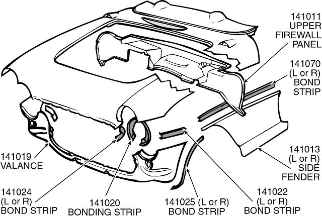 Bonding strips may be installed with your reproduction front end to replicate a more factory finish, although they are not required. IFP or PM front ends come with header bars and nose reinforcements installed