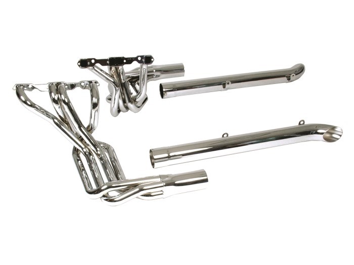 Doug's headers feature thick 3/8 inch flanges and heavy 16-gauge tubing ensuring peak performance and long life. Featuring a 2 1/8 inch primary tube diameter. Matching 4-inch side tubes bolt to existing holes. Better quality than Hooker, XS, Thrush, and just about all other aftermarket side pipe systems.