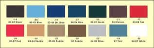 Saddle-Tan was available from 1963 to 1966 and has an order code of 18, so 1965 Saddle-Tan will be written as ‘Saddle Tan 63-66 (18)’